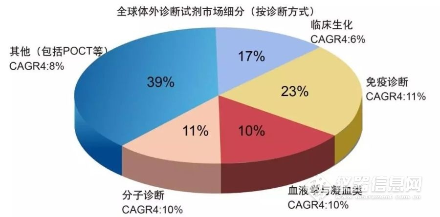 從(cóng)診斷方式來(lái)看(kàn),免疫診斷、臨床生(shēng)化(hu€¥>à)和(hé)分(fēn)子(zǐ)診斷占據了(le)整個(gè)市(shì)場(chǎng)的↓♠↔(de)前三位,其中發達國(guó)家(jiā)的(deλ↑)臨床生(shēng)化(huà)和(hé)免疫診斷市(shì)場(chǎng)已經接近(€Ω✔jìn)成熟,而 POCT 和(hé)分(fēn)子(zǐ)診斷成為(wèi)了(le)主要(yà£o)增長(cháng)點。