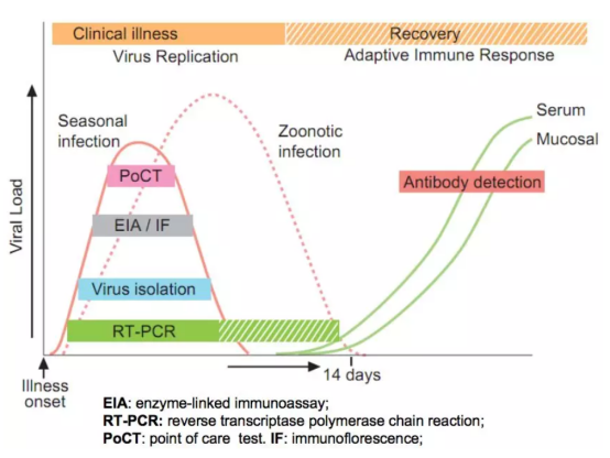由于新型冠狀病毒2019-nCoV的(de)臨床研究有(yǒu)φ©₹限,因此我們參考流感檢測時(shí)間(jiān)窗(chuāng)$π©口明(míng)确當前新冠病毒2019-nCoV的(de)實驗室檢測方法的(de®≠₽)選擇。根據流感檢測的(de)時(shí)間(jiān)窗(₹↕±≠chuāng)口我們可(kě)以看(kàn)到(dào)<✔比如(rú)POCT、熒光(guāng)檢測技(jì)術(shù)✔ελ、病毒分(fēn)離(lí)培養法、RT-PCR、抗體(tǐ)檢測等方法,它★↔們檢測的(de)時(shí)間(jiān)和(hé)時(s∞£πhí)間(jiān)段有(yǒu)所不(bù)同,病毒抗↑♠ 原檢測(以POCT或熒光(guāng)檢測技(jì)術(shù)開(kāi)展),病毒£©™分(fēn)離(lí)培養法和(hé)核酸檢測(以RT-PCR技(jλ₹☆₩ì)術(shù)開(kāi)展)的(de)檢測窗(chuāng)口靠前,抗體(tǐ≤σ)檢測滞後。呼吸道(dào)病毒診斷做(zuò)抗體(tǐ)檢測或者培養在臨床診斷中價值不(bù≥<÷)高(gāo),前者影(yǐng)響因素太多(duō)(如(rú)産±•ππ生(shēng)抗體(tǐ)的(de)時(shí)間(jiān)窗₽→φ(chuāng)較長(cháng),受人(rén)體(tǐ)ε'✔¶自(zì)身(shēn)免疫狀況影(yǐng)響較大(dà)),後者很(hěn)難滿足Ω₩即時(shí)檢測的(de)需求。因此在各項指南(nán)和(hé)共★✘÷Ω識中指出目前臨床上(shàng)針對(duì)流感病毒的(de)病原學檢測集中于抗原檢測和(hé)®★核酸檢測兩項,而針對(duì)新型冠狀病毒2019-nCoV的(de)病原學檢測僅限于核酸'™•檢測。