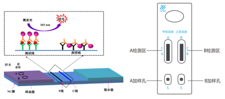将樣品分(fēn)别滴加于檢測卡A、B兩個♦φ(gè)加樣孔,甲型和(hé)(或)乙型流感病毒抗原與熒光(guāng®•δπ)微(wēi)球标記的(de)甲型和(hé)(或)δ✘乙型流感病毒核蛋白(bái)單抗結合後,層析到(dào)測試線被包被抗體(tǐ)捕獲,在365n±§©€m波長(cháng)紫外(wài)照(zhào)射下(xià),呈現(xi ≠∞àn)熒光(guāng)條帶,可(kě)通(tōng)過肉眼判定≈✔甲型和(hé)(或)乙型流感病毒。
