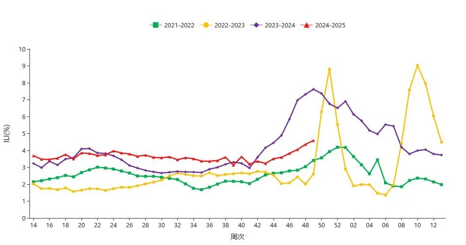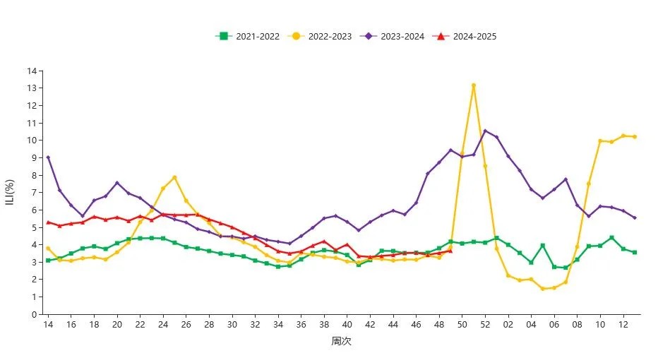 2024年(nián)第49周,北(běi)方省份哨點醫(yī)院報(bào)告的(de)ILI%±∞為(wèi)4.6%,高(gāo)于前一(yī)周水(shuǐγ∞♠)平(4.4%),高(gāo)于2021~2022年(nián)同期水(shuǐ)平(3.4%和(hé) 2.6%),♥©低(dī)于2023年(nián)同期水(shuǐ)平(7.6%"±)。
